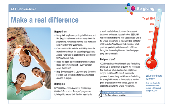 AXA news is designed to foster a sense of community and reinforce the employee value proposition by highlighting diversity and community initiatives. The look is editorial and positive.