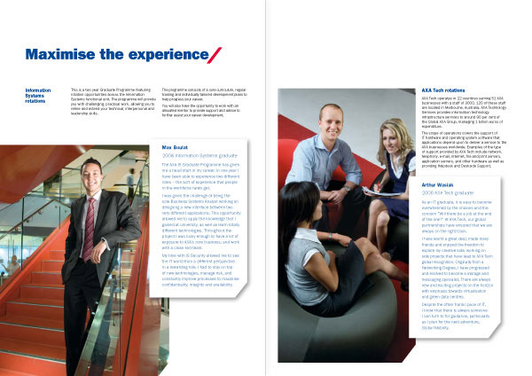 Make AXA more competitive in the IT graduate market with a brochure emphasizing their employee value proposition. Customer insights showed that candidates wanted jobs that ticked their career boxes as well as satisfying their personal criteria, such as flexibility and a diverse range of experiences. My concept and copywriting portrayed AXA as an employer with serious career potential with lifestyle and diversity built in. The story focused on recent hires who'd taken full advantage of the programs AXA had to offer. Photography was shot around AXA's new Melbourne campus to highlight the contemporary work environment.